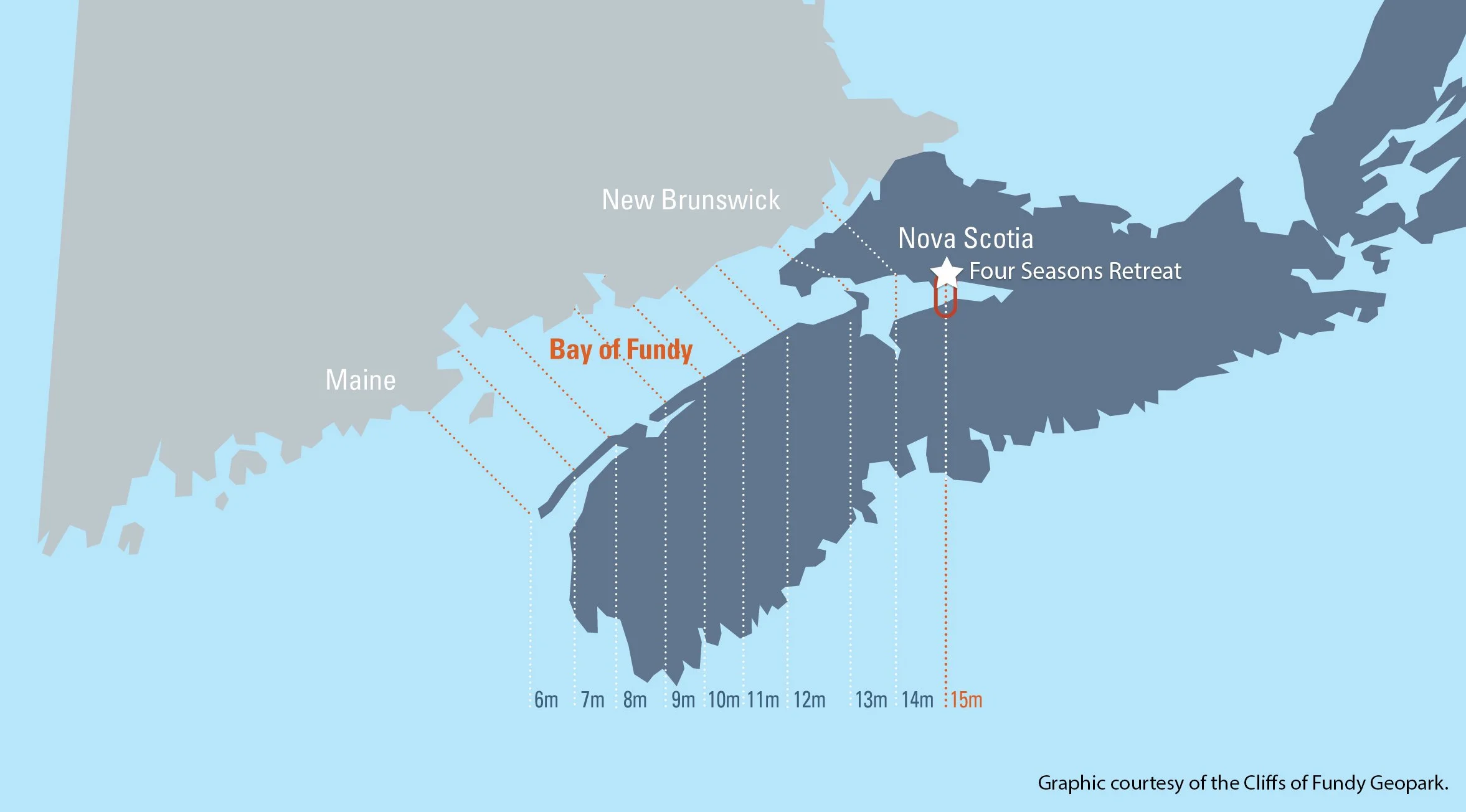 Four Seasons Retreat is Nova Scotia's only resort at the site of the highest tides in the world. Tide heights vary at different locations along the Bay of Fundy, we are at the location where they are the highest. The highest tidal range recorded on Earth - over 16 meters - has been measured in the east-west arm of the bay, the Minas Basin, at a line from Burntcoat Head to Economy Point.